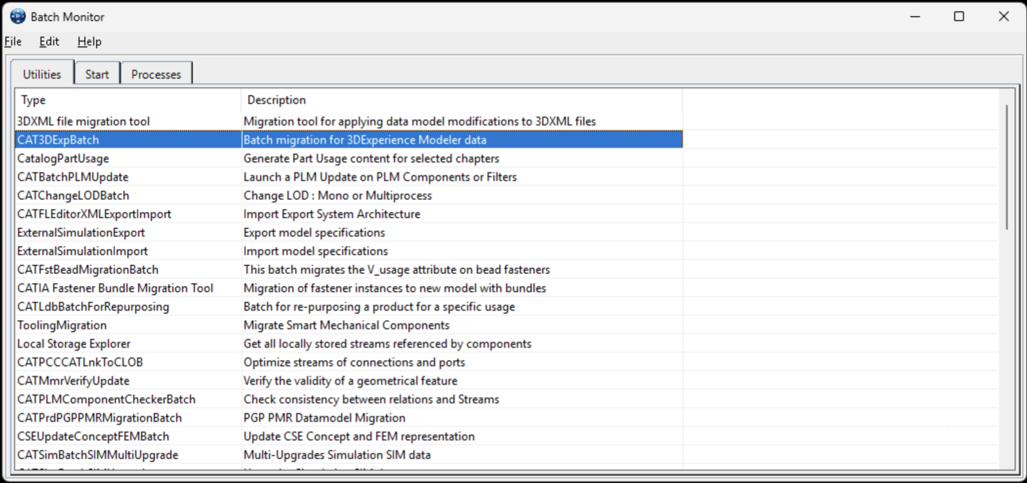 where <3DExperience_Install_Path> should be replaced with the actual path to the 3DExperience installation. Within the utility, start the CAT3DExpBatch tool:
